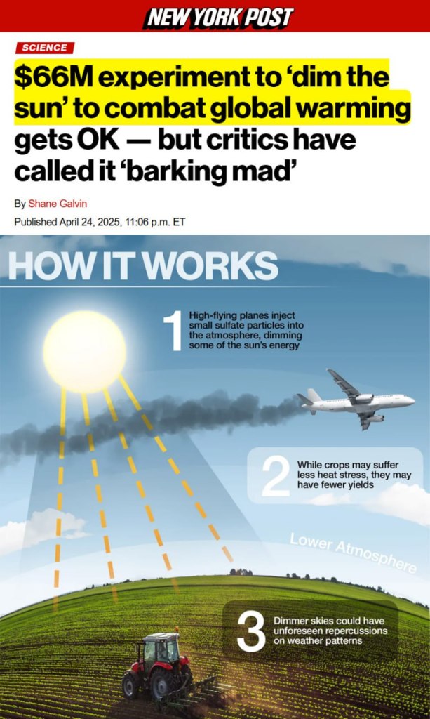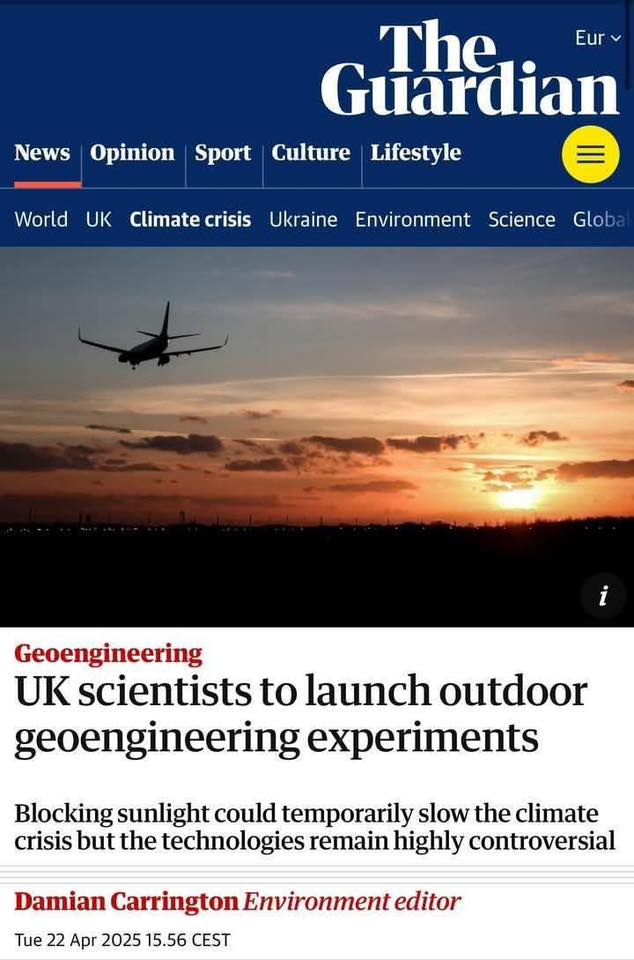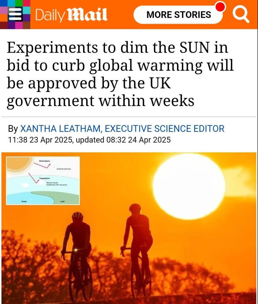 Blocking the Sun? A Dangerous Distraction In March 2024, the UK government announced a £50 million investment in Solar Radiation Management (SRM) — a form of geoengineering that includes spraying aerosols into the atmosphere to reflect sunlight away from the Earth. This includes techniques linked to: Stratospheric aerosol injection (chemtrails) Cloud seeding HAARP-style electromagnetic manipulation